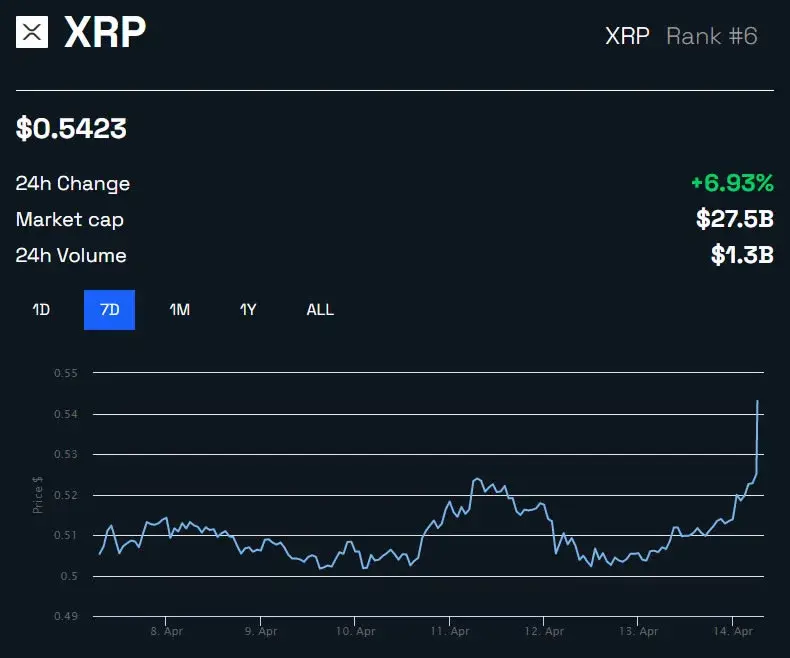 Ripple의 기본 XRP 토큰은 이날 거의 7% 상승했습니다. 결과적으로 XRP는 작성 시점에 $0.542에 거래되었습니다.