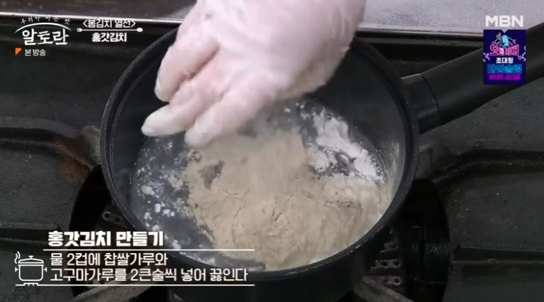 2. 풀국물에 고구마가루를 넣어 겨자의 매운맛을 잡아줍니다.