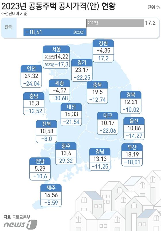 전국 평균은 2022년보다 18.61% 낮아졌다. 2005년 공공임대주택 실태조사·산정제도 시행 이후 상대적으로 하락폭이 컸다. 하락기(2009년 4.6%, 2013년 △4.1%)와 비교하면 약 14%p 낮다.
