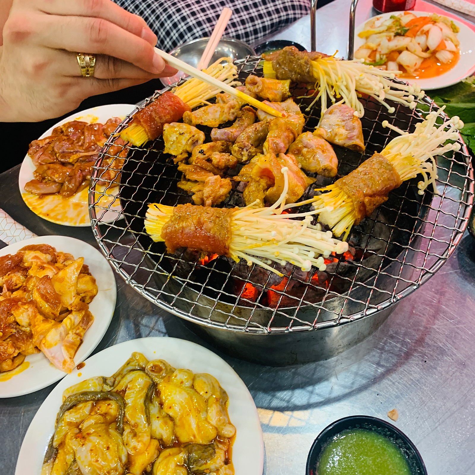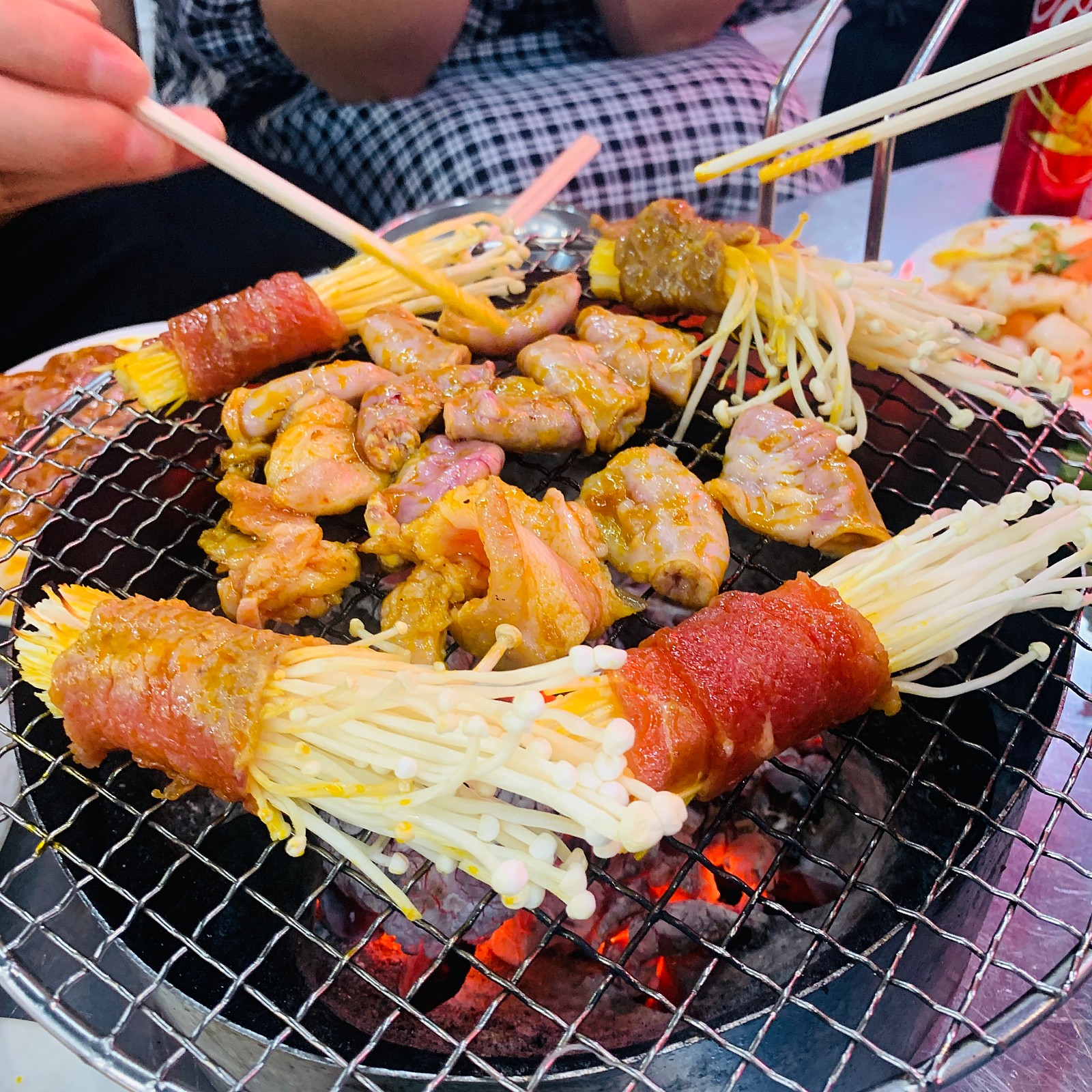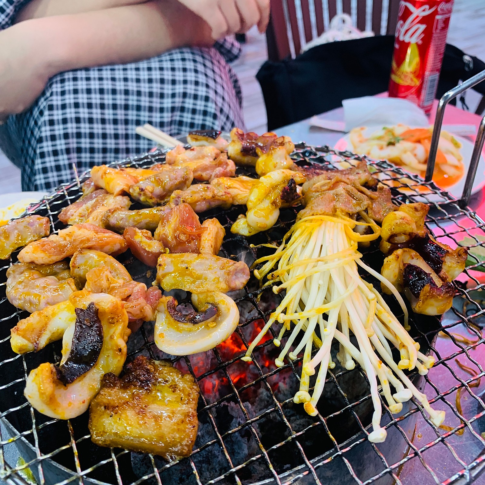 나는 팽이버섯 소고기, 삼겹살, 곱창구이, 오징어구이를 주문했다.